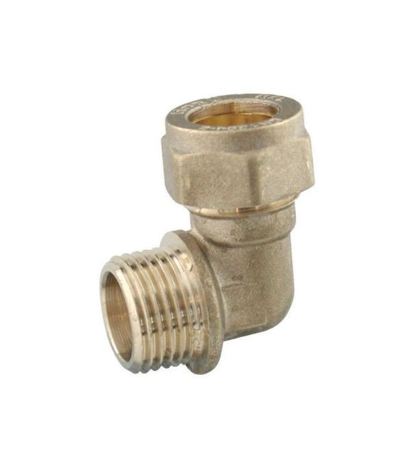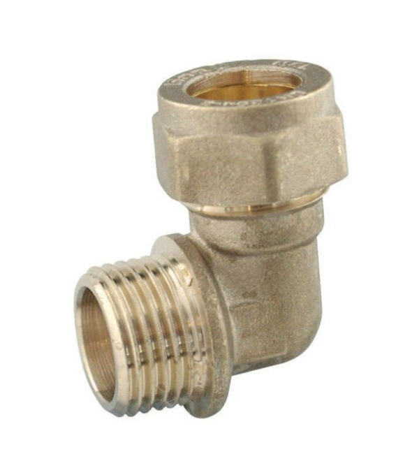 Compression 15mm x 1/2" male iron 90 degree Elbow - supplied with a pre-loaded olive in the nut end of the fitting.