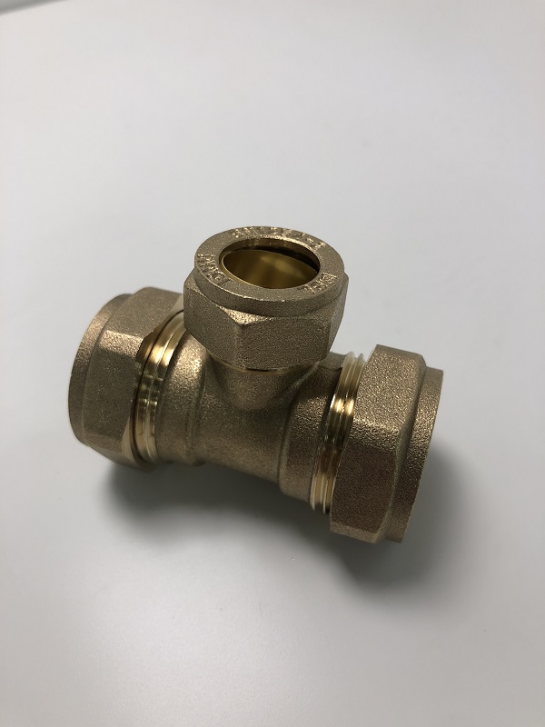 Brass compression Reducing Tee 22mm x 22mm x 15mm on branch. Supplied with pre-loaded olive in nut ends.