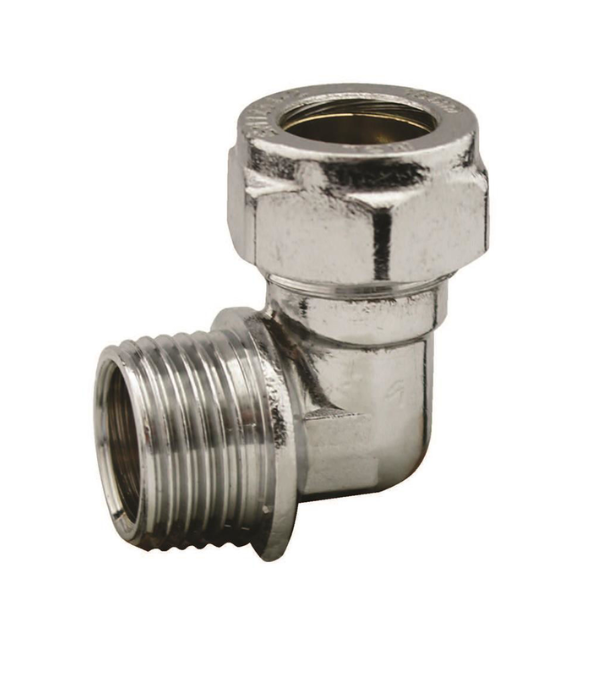 Chrome plated compression 15mm x 1/2" MI 90 degree elbow - supplied with a pre-loaded olive in compression nut.