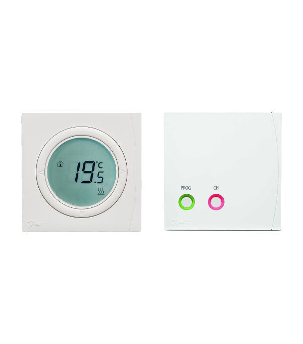The Danfoss RET2001RF + RX1-S (087N6474) includes a battery-powered RF digital room thermostat and a mains-powered single-channel RF receiver. This combination allows precise wireless control of your heating system, offering energy-efficient temperature management and simple installation for modern homes.