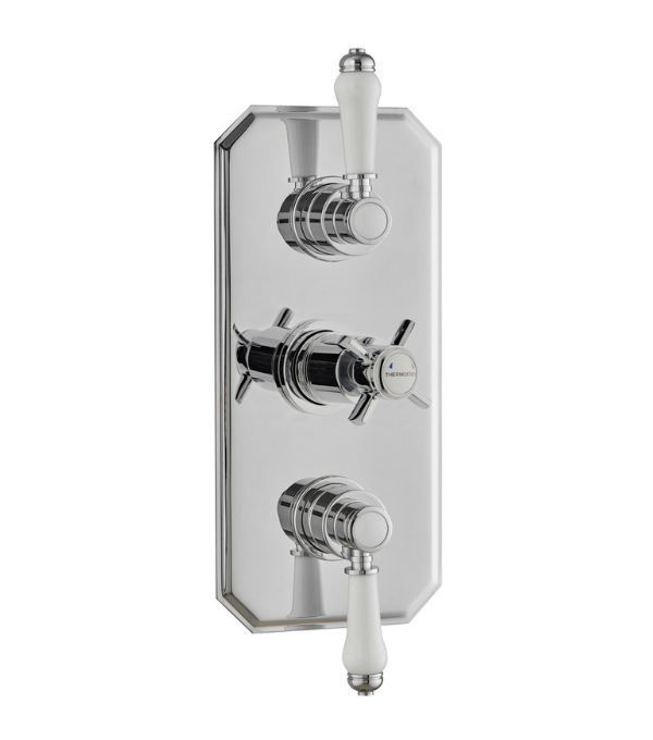 The Kartell Klassique Triple Concealed Thermostatic Shower Valve with traditional handles adds a touch of vintage elegance to your bathroom. Featuring two outlets and a polished chrome finish, this valve provides precise temperature control for a luxurious shower experience.