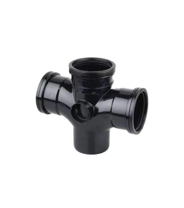 The Wavin OsmaSoil 4S230B S/S Double Branch 87.5° 110mm in black is engineered for efficient soil pipe branching. This robust component allows for precise branching at an 87.5° angle, ensuring reliable performance and durability in both residential and commercial plumbing systems.