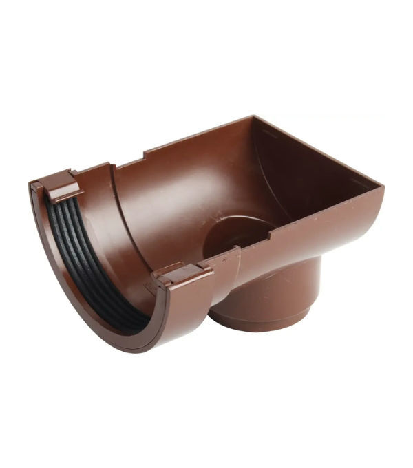 The Wavin Osma RoundLine OT007N Stopend Outlet (Brown, 112 mm) is a high-quality uPVC gutter fitting that combines a stopend and outlet in a single unit, providing a neat and reliable connection from your gutter to a 68 mm downpipe.