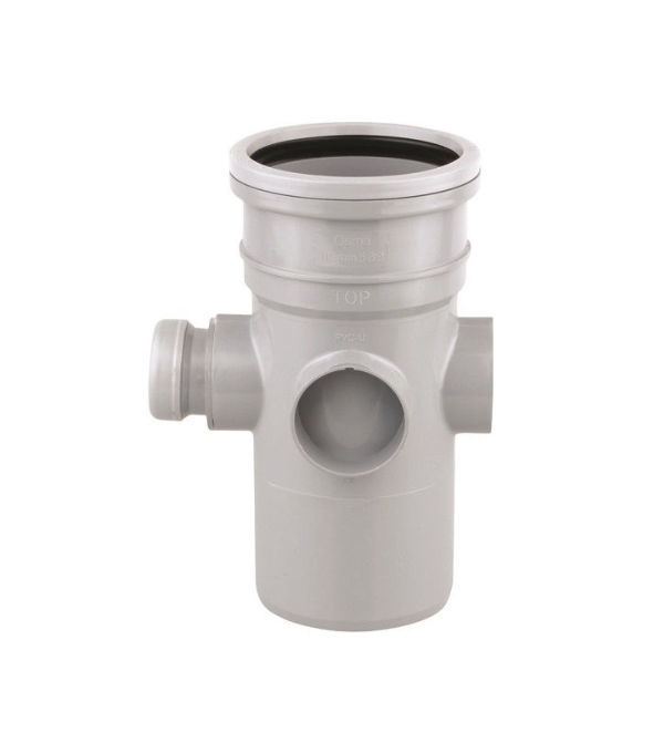 The Wavin OsmaSoil 4S588G Short Boss Pipe in grey is a 110mm durable PVC-U pipe ideal for soil system connections. Featuring a solvent-welded design, it's perfect for compact installations and provides easy branch connections for 32mm and 40mm waste pipes.